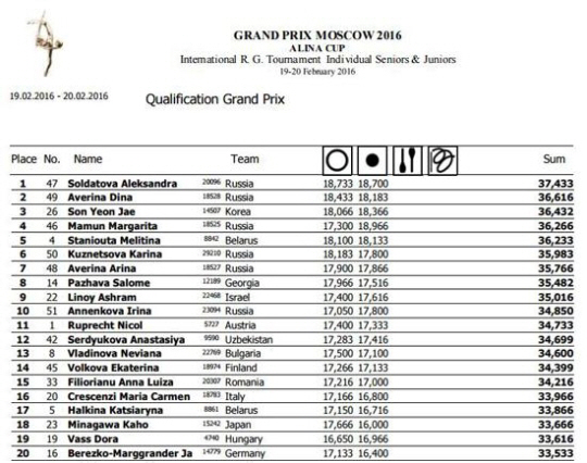 손연재는 2종목 중간합계에서 36,432점을 기록하며 러시아 에이스 알렉산드라 솔다토바(후프 18.733점, 볼, 18.700점, 중간합계 37.433점), 디나 아베리나(후프 18.433점, 볼 18.183점, 중간합계 36.616점)에 이어 3위에 올랐다. 러시아, 동구권 선수 틈바구니에서 선전하며 2종목 모두 결선 진출에 성공했다. 후프에서 실수하며 17.300점을 기록한 러시아 최강 마르가리타 마문(볼 18.966점, 중간합계 36.266점)보다 앞섰다. 지난해 치열한 경쟁을 펼쳤던 벨라루스의 멜리티나 스타니우타를 눌렀다. 스타니우타는 후프에서 18.100점, 볼에서 18.133점, 중간합계 36.233점을 기록했다.