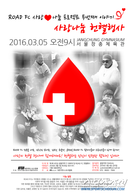 '사랑♡나눔 프로젝트' 사랑 나눔 헌혈이 진행되는 장충체육관에서 일반인도 참여 가능한 종합격투기 아마추어 대회도 열린다. KFSO(대한격투스포츠협회)가 개최하고 ROAD FC가 후원하는 제 1회 KFSO 종합격투기 대축제다.