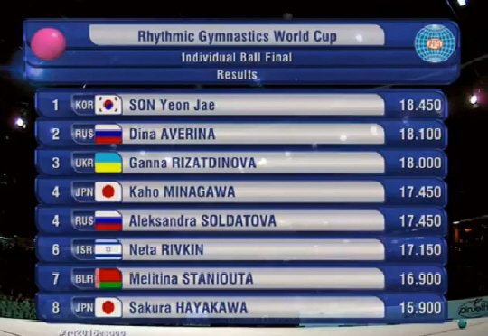 이어진 볼에선 리잣티노바가 첫번째로 매트 위에 섰다. 실시에서 8.9점에 그치며 18.000점을 받았다. 세번째로 등장한 손연재는 완벽한 연기를펼쳐보였다. 영화 '대부'의 삽입곡인 '팔라 피우 피아노(Parla Piu Piano)'에 맞춰. 애절한 느낌을 살린 표현력에 집중했다. 푸에테 피봇, 밸런스 난도의 발끝은 정확했다. 좋은 점수를 예감한 손연재는 주먹을 꽉 쥐며 자신감을 표했다. 키스앤드 크라이존에서 옐레나 니표도바 코치와 기대에 찬 표정으로 점수를 기다리던 손연재가 환호했다. 18.450점을 찍었다. 종목 개인 최고점이었다. 모스크바그랑프리에서 기록한 18.383점을 받았고, 이번 대회 개인종합 예선에서 18.350점을 받았었다.