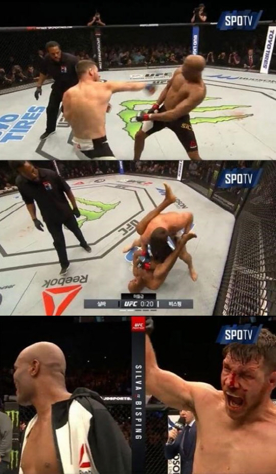 이에 실바는 경기가 끝났다고 생각해 케이지 펜스로 올라가 만세를 부르며 승리 세리머니를 했다. 그러나 아직 경기가 끝나지 않았다고 하자, 실바는 말도 안 된다는 표정을 지었다.