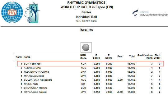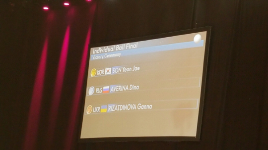손연재는 이번 대회 개인종합 은메달에 이어 종목별 결선에서 금메달 1개(볼), 은메달 1개(리본), 동메달 1개(후프)를 고루 챙겼다. 곤봉에서 수구를 떨어뜨리는 실수를 한 것이 유일한 옥에 티였다. 이날 시상식 직후 이번 대회 가장 인기 있고, 가장 빛난 선수에게 주어지는 '샤이닝상'의 영예도 안았다. '반짝반짝' 손연재는 핀란드에서 가장 빛난 별이었다.
