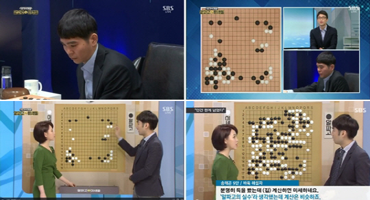 한편 이날 대국 생중계를 진행한 SBS는 국내 최고의 전문가들과 함께 세기의 빅매치를 성공적으로 중계해 주목을 받았다. 이날 진행자로 나선 배기완 아나운서와 전 프로바둑기사 회장 김효정 프로는 친절한 설명과 함께 패널들의 대화를 이끌어 내며 매끄러운 진행능력을 보여주었다. 특히 김효정 프로는 대마, 미생, 패싸움, 계가, 초읽기, 불계패 등 바둑을 처음 접하는 시청자에게 생소할 수 있는 용어들을 쉽게 설명하며 이해를 도왔다. 또한 이날 패널로 출연한 인공지능 최고의 전문가 카이스트 정재승 교수와 김태훈 칼럼니스트는 인공지능의 현재에 대한 다양한 정보와 바둑의 역사 등을 알려주며 중계에 재미를 더했다.