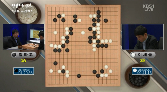 전날과 다르게 돌을 바꿔 흑을 잡은 알파고의 첫 착수는 우상귀 화점. 이에 맞서 이세돌 9단은 좌하귀 화점으로 대응하는 등 2국 때와 비슷한 양상을 보였다. 하지만 이세돌 9단이 12수에서 비틀면서 다른 진행으로 가져갔다.
