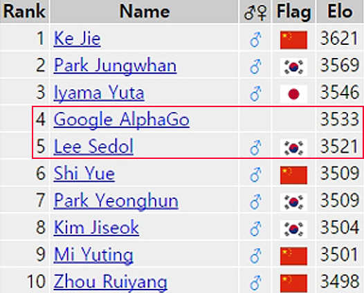 랭킹상으론 알파고는 혜성처럼 나타난 신예 초고수다. 알파고의 점수는 무려 3533점으로, 이세돌(3521·5위)-박영훈-김지석(이상 3509·이상 6위) 9단 등 한국 주요기사들보다 윗자리를 차지했다. 알파고보다 위에 있는 한국 기사는 박정환(3569·2위) 9단 뿐이다.