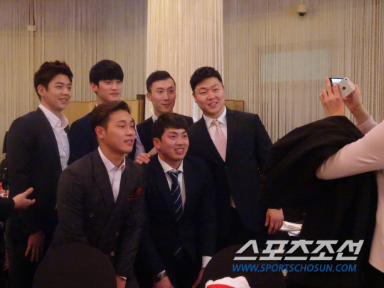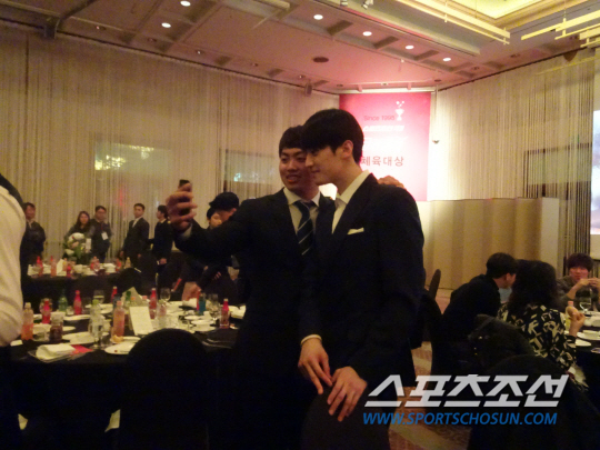 이날 코카콜라체육대상 수상자석 분위기는 그 어느 때보다 화기애애했다. 오는 8월 리우올림픽을 준비하는 '여름청년' 이용대-유연성(이상 배드민턴), 이대훈(태권도)과 2년 후 평창올림픽을 준비하는 '겨울청년' 원윤종-서영우(이상 봅슬레이) 윤성빈(스켈레톤)은 한 테이블에서 서로를 축하하며, 금세 친구가 됐다. 휴대폰 번호를 교환하더니, 함께 기념사진을 찍기 시작했다. 성격 좋은 서영우가 유연성, 이대훈 등과 '셀카(셀프카메라)'를 찍더니, 어느새 6명의 청년이 한데 뭉쳤다. 환한 미소로 한방향을 바라보는 6인의 단체샷은 훈훈했다.