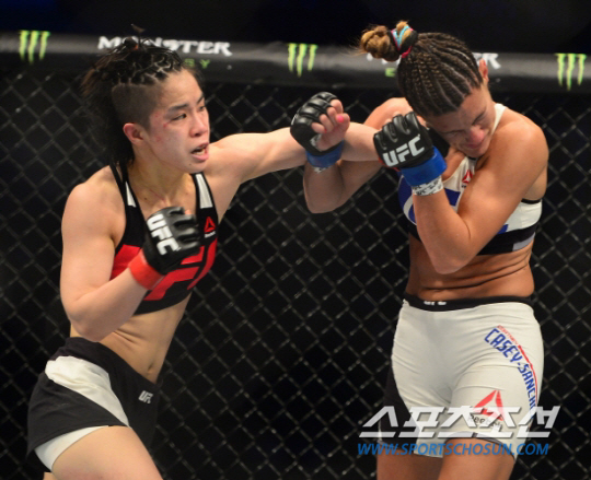 함서희가 2015년 11월 28일 서울 방이동 올림픽 체조경기장에서 열린 'UFC 파이트 나이트 서울(UFN79)'에서 코트니 케이시에게 펀치를 날리는 모습. 이날 승리를 거뒀던 함서희는 2016년 3월 20일 호주에서 열린 벡 롤링스와의 경기에선 판정패했다. 송정헌 기자 songs@sportschosun.com/2015.11.28