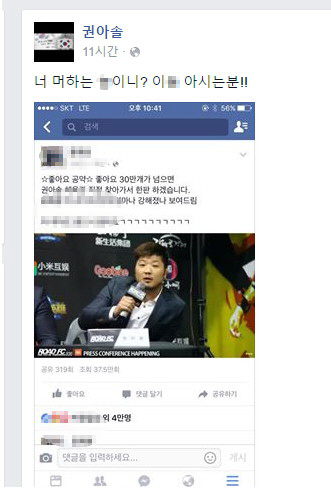 권아솔은 지난 6일 자신의 SNS에 "너 머하는 X니? 이X 아시는 분"이라는 글과 함께 한 글을 링크했다.
