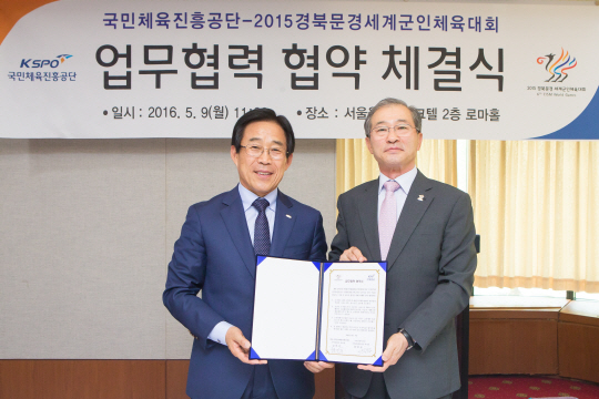 업무협약식을 맺고 있는 국민체육진흥공단 이창섭 이사장과 2015경북문경세계군인체육대회 조직위원회 김상기 공동위원장. 국민체육진흥공단 제공