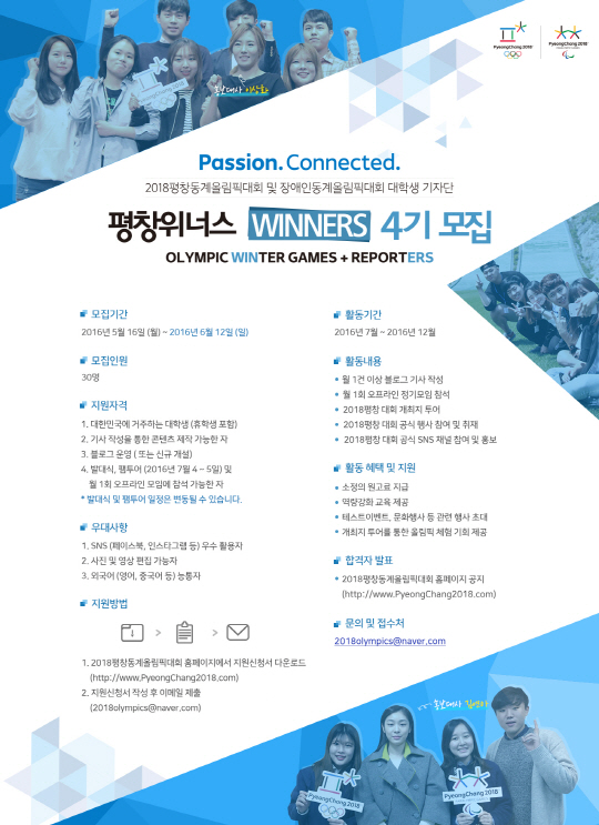 2018년 평창 동계올림픽 및 장애인동계올림픽 조직위원회가 대학생 블로그 기자단인 '평창 위너스' 4기를 모집한다.