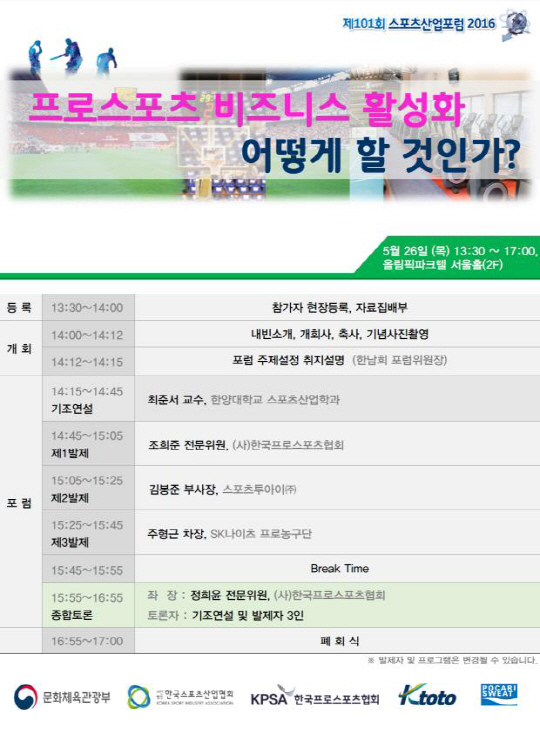 기조 연설은 한양대 스포츠산업학과 최준서 교수가 맡았으며 한국프로스포츠협회 조희준 전문위원, 스포츠투아이 김봉준 부사장, SK나이츠 프로농구단 주형근 차장 총 3명의 발제자가 발표한다.
