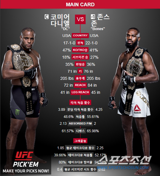 챔피언과 챔피언의 대결. 코미어가 이전 대결 패배를 앙갚음하며 챔피언 벨트를 지킬지, 아니면 존스가 다시 왕좌에 오르며 연승행진을 이어갈지 초미의 관심을 모은다. 존스는 "전 챔피언이란 말이 싫다. '전'이란 말을 지우고 싶다"며 승리를 자신했고, 코미어 역시 "죽느냐 사느냐의 대결이다. 두번 지지 않겠다"며 설욕을 약속했다.