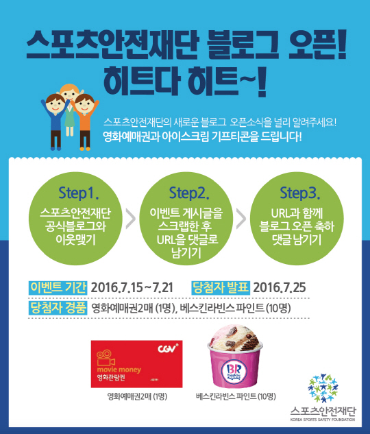 이벤트 진행방식은 재단 공식블로그(http://blog.naver.com)에서 이웃추가 신청 및 이벤트 게시글 스크랩, URL 주소와 함께 오픈 축하 댓글을 남기면 참가자 중 추첨을 통해 총 31명에게 CGV 영화 관람권과 베스킨라빈스 파인트, 스타벅스 아메리카노 등 상품을 증정한다.