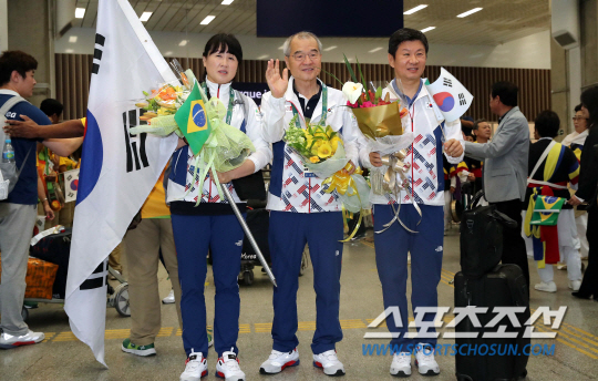 대한민국 올림픽 대표팀 오영란(왼쪽부터), 대한체육회 강영중 회장, 정몽규 선수단장이 27일 오후 (현지시간) 브라질 리우데자네이루 갈레앙 국제공항을 통해 입국해 교민들과 취재진을 향해 손을 흔들고 있다. /2016.7.27./리우=올림픽사진공동취재단