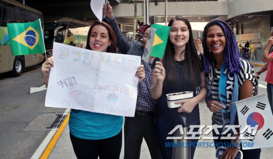 대한민국 올림픽 대표팀 선수단이 27일(현지시간) 2016 브라질 리우올림픽에 참가하기 위해 리우데자네이루 갈레앙 국제공항에 입국한 가운데 한류 팬들이 선수단을 응원하고 있다./2016.7.27./리우=올림픽사진공동취재단