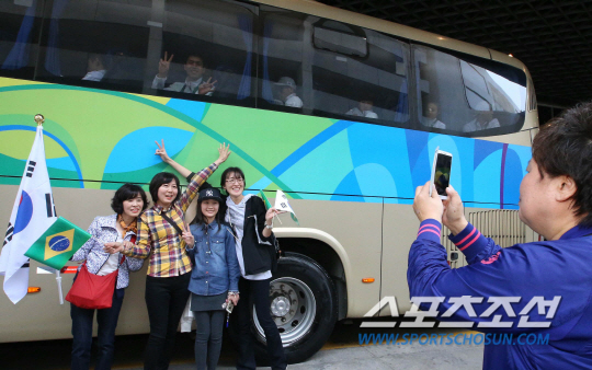 27일(현지시간)오후 제 31회 리우데자네이루 하계올림픽에 출전하는 한국 선수단 본진이 브라질 리우 국제공항에 도착했다. 교민들이 선수단 버스 앞에서 기념사진을 찍고있다. 2016./7./27/리우=올림픽사진공동취재단 D