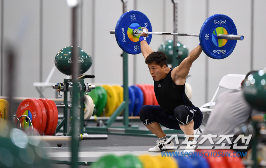2016 리우올림픽이 5일 앞으로 다가온 가운데 한국 역도대표팀 선수단이 30일(현지시간) 브라질 리우데자네이루 리우센터 파빌리온5에서 훈련을 펼쳤다. 원정식이 바벨을 들어올리고 있다.