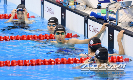 한국 수영대표팀이 31일 오후(현지시간) 브라질 리우데자네이루 올림픽 아쿠아틱 스타디움에서 훈련을 펼쳤다. 최규웅, 백수연, 박진영, 남유선, 원영준이 훈련 중 잠시 이야기를 나누고 있다.