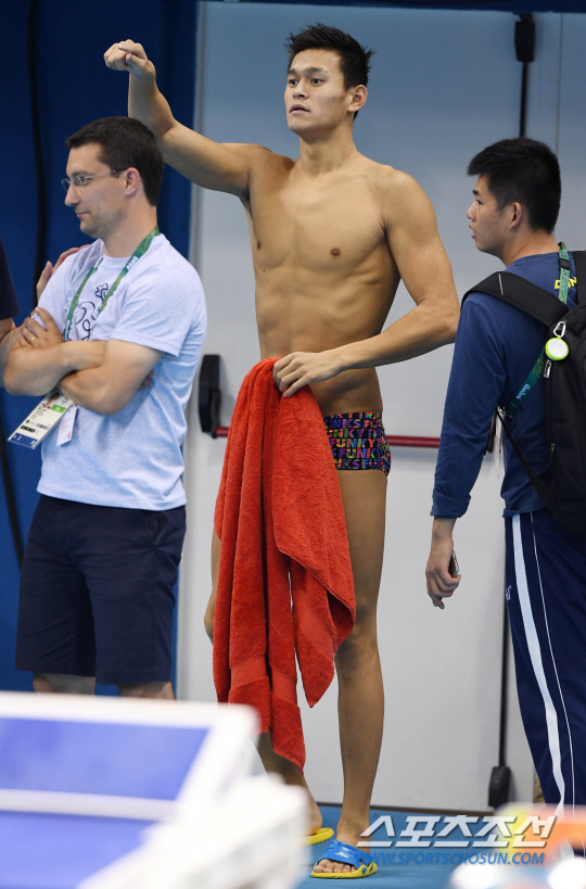 박태환과 금메달 경쟁을 펼칠 중국의 쑨양이 1일 오후(현지시간) 브라질 리우데자네이루 올림픽 아쿠아틱 스타디움에서 보조수영장에서 훈련을 마치고 프로필 사진 촬영을 위해 발걸음을 옮기고 있다./2016.08.01/리우데자네이루=올림픽사진공동취재단 N