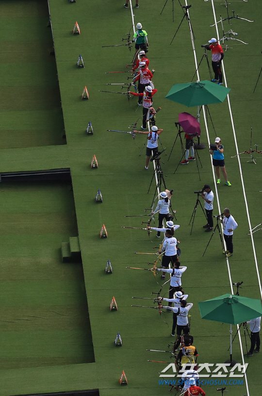 대한민국 양궁 대표 선수들을 비롯한 선수들이 1일 오후(현지시간) 브라질 리우데자네이루 마라카낭 삼보드로무 양궁경기장에서 훈련을 하고 있다.
