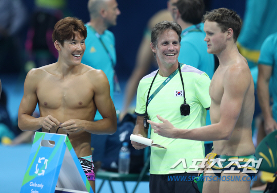 수영 박태환 선수가 1일 오후(현지시간) 리우데자네이루 바하 올림픽 수영장에서 훈련 전 다른 선수와 이야기를 나누며 밝게 웃고 있다. /2016.8.1/리우데자네이루=올림픽사진공동취재단 H