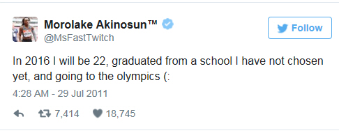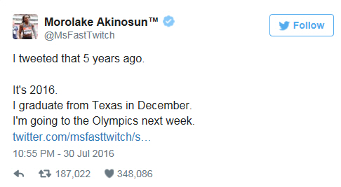 리우올림픽을 앞두고 이같은 목표설정 이론의 효과가 입증됐다. 주인공은 미국 여자 육상 대표팀 유망주 모롤레이크 아키노슨(22). 5년 전인 2011년 그는 자신의 트위터에 이런 글을 남겼다. "2016년 나는 아직 정하지 못한 학교를 졸업해 있을 것이고 올림픽에 가게 될 것이다."