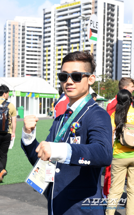 2016 리우 올림픽에 출전하는 대한민국 선수단이 2일 오전(현지시간) 브라질 리우데자네이루 바하 올림픽 선수촌에서 공식 입촌식을 가졌다. 입촌식 행사 전 복싱 함상명이 취재진에 포즈를 취하고 있다.