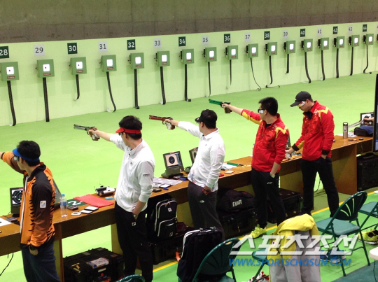 연습 중인 진종오 옆에 팡웨이(중국)가 자리를 잡았다. 진종오가 라이벌로 꼽은 선수다. 팡웨이는 진종오가 은메달을 딴 2008년 베이징올림픽 10m 공기권총에서 금메달을 땄다. 세계 대회에서도 종종 진종오의 발목을 잡았다. 진종오의 사격 모습을 지켜보던 팡웨이가 바로 옆 사대에 서자 박 코치는 "종오의 리듬을 직접 확인하겠다는 뜻이다. 그만큼 종오가 신경 쓰인다는 얘기"라고 설명했다.