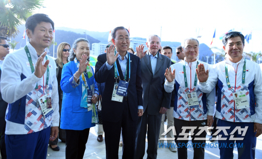 반기문 UN 사무총장이 4일 오후(현지시간) 브라질 리우데자네이루 바하 올림픽선수촌 한국팀을 방문해 정몽규 선수단장, 유순택, 자크 로게 전 IOC 위원장, 조영호 대한체육회 사무총장과 김성조 코리아하우스 단장(왼쪽부터)과 기념촬영을 하고 있다. /2016.8.4/리우데자네이루=올림픽사진공동취재단 M