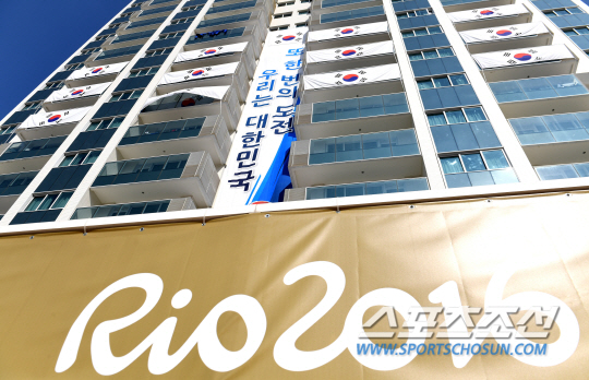 대한민국 선수단은 4일(현지시간) 브라질 리우데자네이루 바하 올림픽선수촌 숙소동 외벽에 대형 현수막 및 태극기를 설치했다. 이번에 설치된 대형 현수막은 23m *3.8m 크기로 '또 한 번의 도전, 우리는 대한민국'이라는 슬로건을 담고 있으며, 현수막 외에도 40장의 태극기 및 'Team Korea' 현수막 등이 외벽을 장식했다. /2016.8.4/리우데자네이루=올림픽사진공동취재단