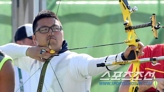 남자 양궁 김우진 선수가 5일(현지시간) 브라질 리우 마라카낭 삼보드로무 양궁경기장에서 열린 개인 예선전에서 활시위를 당기고 있다./2016.8.5./리우데자네이루=올림픽사진공동취재단