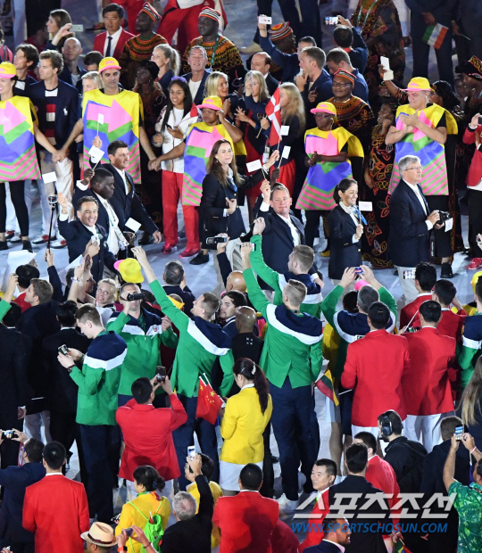 사상 최초로 남미 대륙에서 열리는 2016 리우데자네이루 올림픽이 5일 오후(현지시간) 브라질 리우데자네이루의 마라카낭 주경기장에서 막을 올렸다. 사상 최초의 난민 대표팀이 국기가 아닌 오륜기와 함께 입장하고 있다.