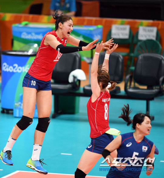 김연경 선수가 6일 오전(현지시간) 브라질 리우데자네이루 마라카나징유 배구 경기장에서 진행된 2016 리우올림픽 여자배구 조별예선 1차전 대한민국-일본의 경기에서 득점 후 환호하고 있다./2016.8.6/리우데자네이루=올림픽사진공동취재단 M
