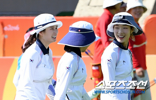 여자 양궁(왼쪽부터) 기보배, 장혜진,최미선 선수가 5일(현지시간) 브라질 리우 마라카낭 삼보드로무 양궁경기장에서 열린 개인 예선전에서 1라운드를 끝내고 밝은 표정으로 과녁을 확인하기위해 걷고 있다./2016.8.5./리우데자네이루=올림픽사진공동취재단