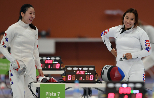 펜싱 에뻬의 신아람 선수(왼쪽)와 강영미가 1일 오전(현지시간) 브라질 리우데자네이루 바하 올림픽파크 파빌리온 훈련장에서 연습경기를 준비하고 있다. /2016.8.1/ 리우데자네이루=올림픽사진공동취재단 C