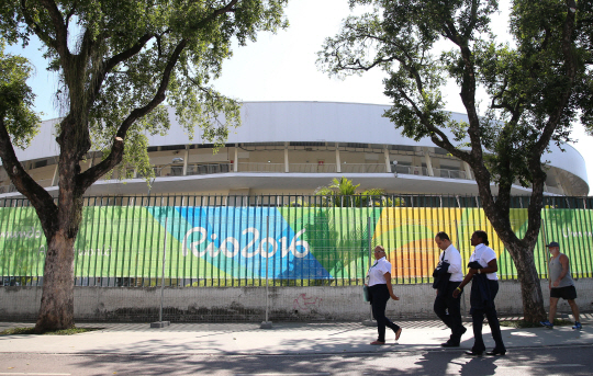 | 26일(현지시간) 오전 올림픽을 앞둔 브라질 리우 올림픽 주경기장 앞을 관계자들이 지나가고있다. /2016.7.26/리우=올림픽사진공동취재단 |