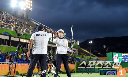 여자 양궁 기보배 선수가 8일(현지시간) 브라질 리우 마라카낭 삼보드로무 양궁경기장에서 열린 개인 32강전에서 10점에 명중 시킨뒤 양창훈 감독과 손을 잡고 있다./2016.8.8./리우데자네이루=올림픽사진공동취재단L