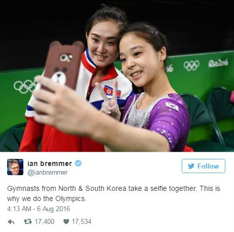 이안 브레머 유라시아그룹 회장은 지난 6일 자신의 트위터에 대한민국 체조국가대표 이은주(17·강원체고)와 북한 체조 스타 홍은정(27)이 다정하게 셀카를 찍고 있는 사진을 공개했다. 후배 이고임의 부상으로 갑작스레 리우행이 결정된 이은주는 홍은정과 같은 조에서 예선을 치르며 친해졌다. 홍은정은 2008년 베이징올림픽 도마 금메달리스트로 언니 홍수정과 함께 북한을 대표하는 체조스타다.