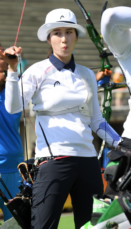 5일 오후(현지시간) 브라질 리우데자네이루 마라카낭 삼보드로무 양궁장에서 열린 2016 리우 올림픽 양궁 여자 개인전 경기에서 기보배 선수가 밝은 모습으로 경기를 펼치고 있다. /2016.8.5/리우데자네이루=올림픽사진공동취재단 N