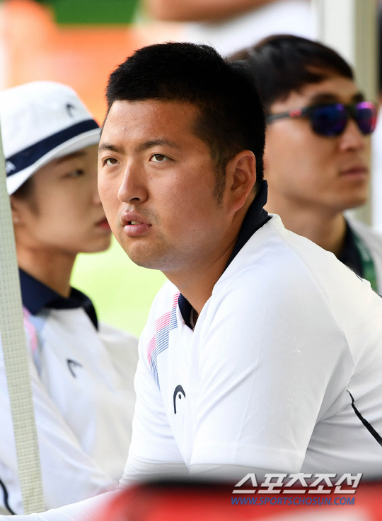 브라질 리우데자네이루 올림픽 2관왕에 도전했던 한국 양궁대표팀의 김우진(청주시청)이 남자 개인전 32강에서 충격패를 당한 8일(현지시각) 경기후 코치진들과 무거운 표정으로 이야기를 나누고 있다.