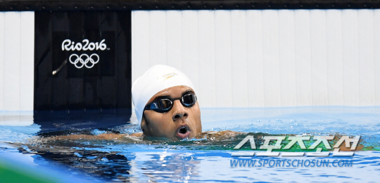 난민팀의 라미 아니스 선수가 9일 오후(현지시간) 브라질 리우데자네이루 바하 올림픽 아쿠아틱 스타디움에서 열린 2016 리우 올림픽 수영 남자 자유영 100m 예선에 출전했다.골인 후 기록을 살피는 라미 아니스의 모습.