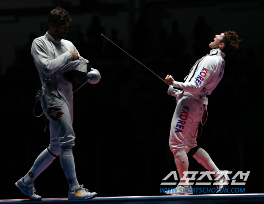 남자펜싱 박상영 선수가 5일(현지시간) 브라질 리우데자네이루 바하 올림픽파크 카리오카 경기장3에서 열린 펜싱 남자 에페 4강전에서 상대 스위스의 스테펜에게 승리한 뒤 세레ㅓ니를 하고 있다. /2016.8.9 /리우데자네이루=올림픽사진공동취재단F
