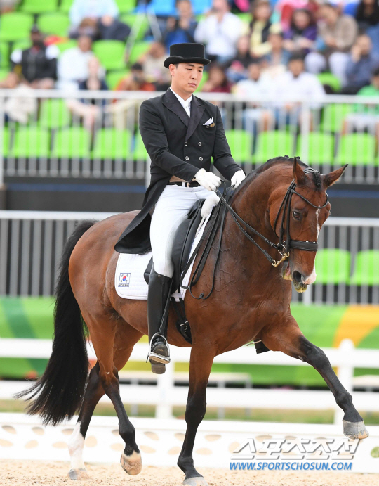 한국 승마대표팀의 김동선이 1일 오전(현지시간) 브라질 리우데자네이루 올림픽 승마 경기장에서 열린 개인 마장마술 그랑프리 1차전에서 연기를 펼치고 있다. /2016.8.10/ 리우데자네이루=올림픽사진공동취재단 C