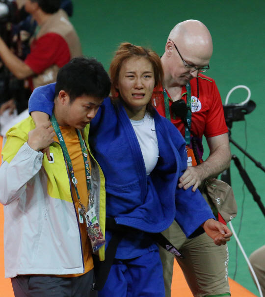 리우올림픽 여자 유도 63㎏급 32강전이 열린 9일 브라질 리우데자네이루 올림픽파크 카리오리카 아레나2. 박지윤이 왼 무릎을 부여잡고 한동안 일어나지 못했다. 경기장을 벗어나면서도 의료진의 부축이 필요했다. 그는 이 경기에서 영국의 알리스 쉴레징어(세계랭킹 8위)에게 한판패 했다. 경기 종료 1분1초전 허리후리기에 당했다.