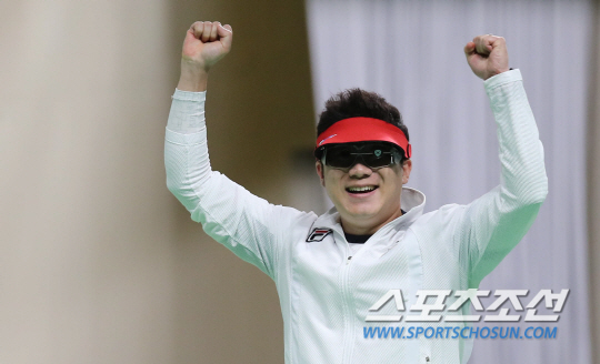 진종오 선수가 10일 오후 (현지시간) 브라질 리우데자네이루 데오도루 올림픽 사격장에서 열린 남자 50m 권총 결선에서 금메달을 획득한 뒤 손을 들어 보이고 있다./2016.8.10/리우데자네이루=올림픽사진공동취재단 k