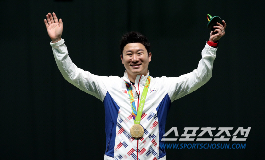 진종오 선수가 10일 오후 (현지시간) 브라질 리우데자네이루 데오도루 올림픽 사격장에서 열린 남자 50m 권총 시상식에서 손을 흔들고 있다./2016.8.10/리우데자네이루=올림픽사진공동취재단 k