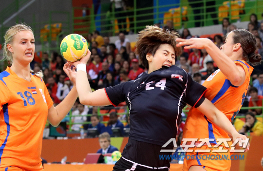 10일 오후(현지시간) 브라질 리우데자네이루 바하 퓨처아레나에서 열린 여자 핸드볼 조별리그 B조 3차전 네덜란드와 경기에서 권한나 선수가 상대선수를 제치고 슛을 날리고 있다. /2016.8.10./리우데자네이루=올림픽사진공동취재단 P