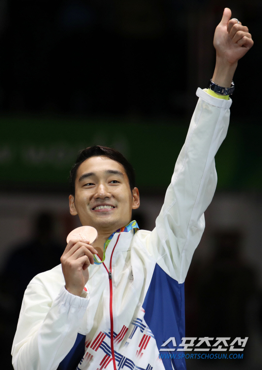 남자펜싱 김정환이 10일(현지시간) 브라질 리우데자네이루 바하 올림픽파크 카리오카 경기장3에서 열린 펜싱 남자 개인 사브르 시상식에서 동메달을 받고 기뻐하고 있다/2016.8.10/ 리우데자네이루=올림픽사진공동취재단