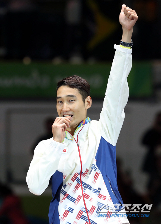 김정환이 10일(현지시간) 브라질 리우데자네이루 바하 올림픽파크 카리오카 경기장3에서 열린 펜싱 남자 개인 사브르 시상식에서 동메달을 물어보고 있다./2016.8.10/ 리우데자네이루=올림픽사진공동취재단