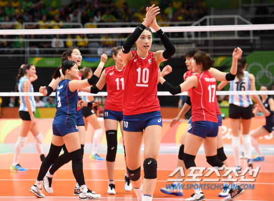 10일 오후(현지시간) 브라질 리우데자네이루 마라카나징유 경기장에서 열린 2016 리우 올림픽 여자배구 한국과 아르헨티나의 경기에서 여자배구 대표팀 선수들이 공격을 성공한 후 환호하고 있다./2016.08.10/리우데자네이루=올림픽사진공동취재단