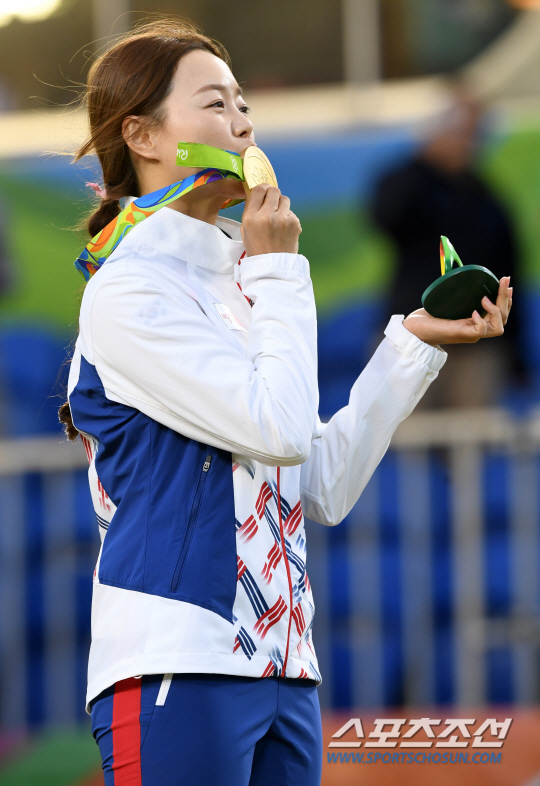 여자양궁 대표팀 장혜진이 11일 오후(현지시간) 브라질 리우데자네이루 마라카낭 삼보드로무 양궁장에서 열린 2016 리우 올림픽 양궁 여자 개인전 결승에서 승리하며 금메달을 획득했다. 시상대에 올라 금메달에 키스를 하는 장혜진./2016.8.11/리우데자네이루=올림픽사진공동취재단 N